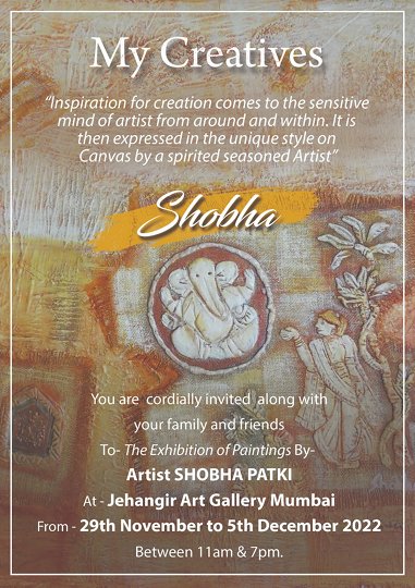 A solo art exhibition showcasing vivid innovative artworks made by a veteran Pune based artist Shobha Patki during last 40 years of her art journey has been displayed at Jehangir Art Gallery, M.G.Road, Kala Ghoda, Mumbai 400 001 from 29th November to 5th December 2022 between 11 am to 7 pm.