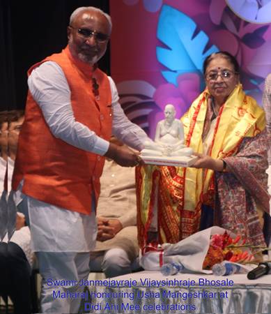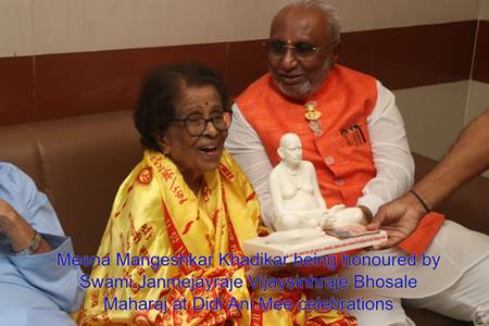 यानंतर सभागृहात एक राजेशाही शांतता उतरली. अक्कलकोट संस्थानचे स्वामी जंजमेयराजे विजयसिंहराजे भोसले महाराज अत्यंत नम्रतेने उभे राहिले आणि म्हणाले —“इथे उपस्थित राहणे ही माझ्यासाठी आशीर्वादासारखी अनुभूती आहे. मंगेशकरांसारख्या दिग्गज कुटुंबाकडून स्नेह आणि आशीर्वाद मिळणे — हाच माझा सन्मान आहे.”हे आशीर्वाद नव्हते — हे कृतज्ञतेने झुकलेलं मानवी नम्रतेचं सौंदर्य होतं.